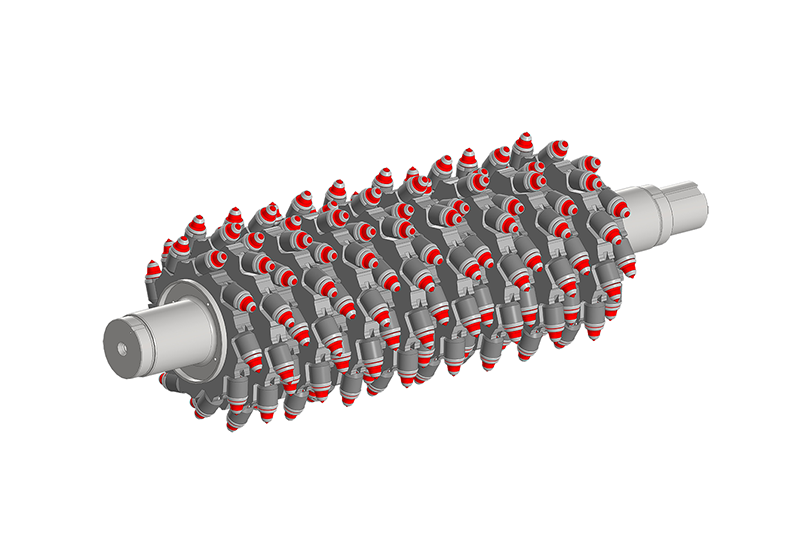 带刀架的轴是焊接结构,由直径325 mm、长度2260 mm的主轴组成,60 mm厚的环,用于安装刀架,共169个刀架,由外壳和耐磨衬套组成,套筒安装在带有张力着陆的刀架外壳中,Gorny工具有限责任公司生产的刀具安装在耐磨套筒中,并用可伸缩环固定。刀具和刀架的设计包括一个耐磨堆积在车身上,以确保在操作过程中保护刀架。